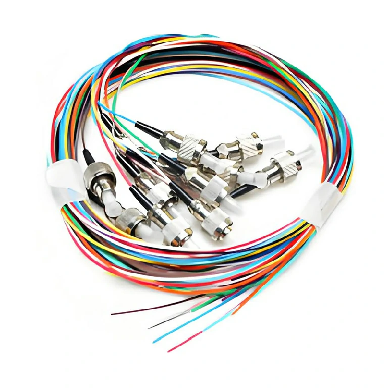 0.9 pigtail, also known as pigtail bundle, is divided into bundled and ribbon pigtails. It has a connector at only one end, and the other end is a broken end of an optical fiber, which is connected to other optical cable cores through fusion splicing. It often appears in optical cable termination boxes or is coiled in 12-core integrated trays for use in optical cable cross-connect cabinets; Used for connecting optical cables and terminal equipment. Pigtails are divided into multimode pigtails and single-mode pigtails. Multimode pigtails are orange, with a wavelength of 850nm and a transmission distance of 500m, used for short-distance interconnection. Single-mode pigtails are yellow, with two wavelengths: 1310nm and 1550nm, and transmission distances of 10km and 40km respectively. It consists of 12 pigtails, with colors in order: blue, orange, green, brown, gray, white, red, black, yellow, purple, pink, light blue.