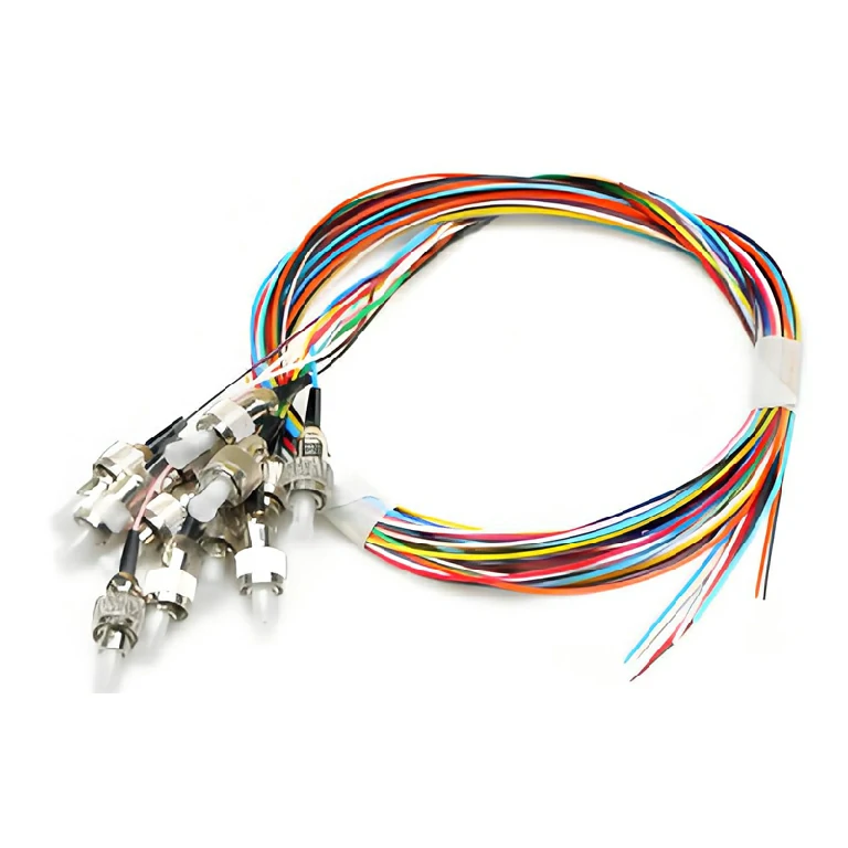 0.9 pigtail, also known as pigtail bundle, is divided into bundled and ribbon pigtails. It has a connector at only one end, and the other end is a broken end of an optical fiber, which is connected to other optical cable cores through fusion splicing. It often appears in optical cable termination boxes or is coiled in 12-core integrated trays for use in optical cable cross-connect cabinets; Used for connecting optical cables and terminal equipment. Pigtails are divided into multimode pigtails and single-mode pigtails. Multimode pigtails are orange, with a wavelength of 850nm and a transmission distance of 500m, used for short-distance interconnection. Single-mode pigtails are yellow, with two wavelengths: 1310nm and 1550nm, and transmission distances of 10km and 40km respectively. It consists of 12 pigtails, with colors in order: blue, orange, green, brown, gray, white, red, black, yellow, purple, pink, light blue.